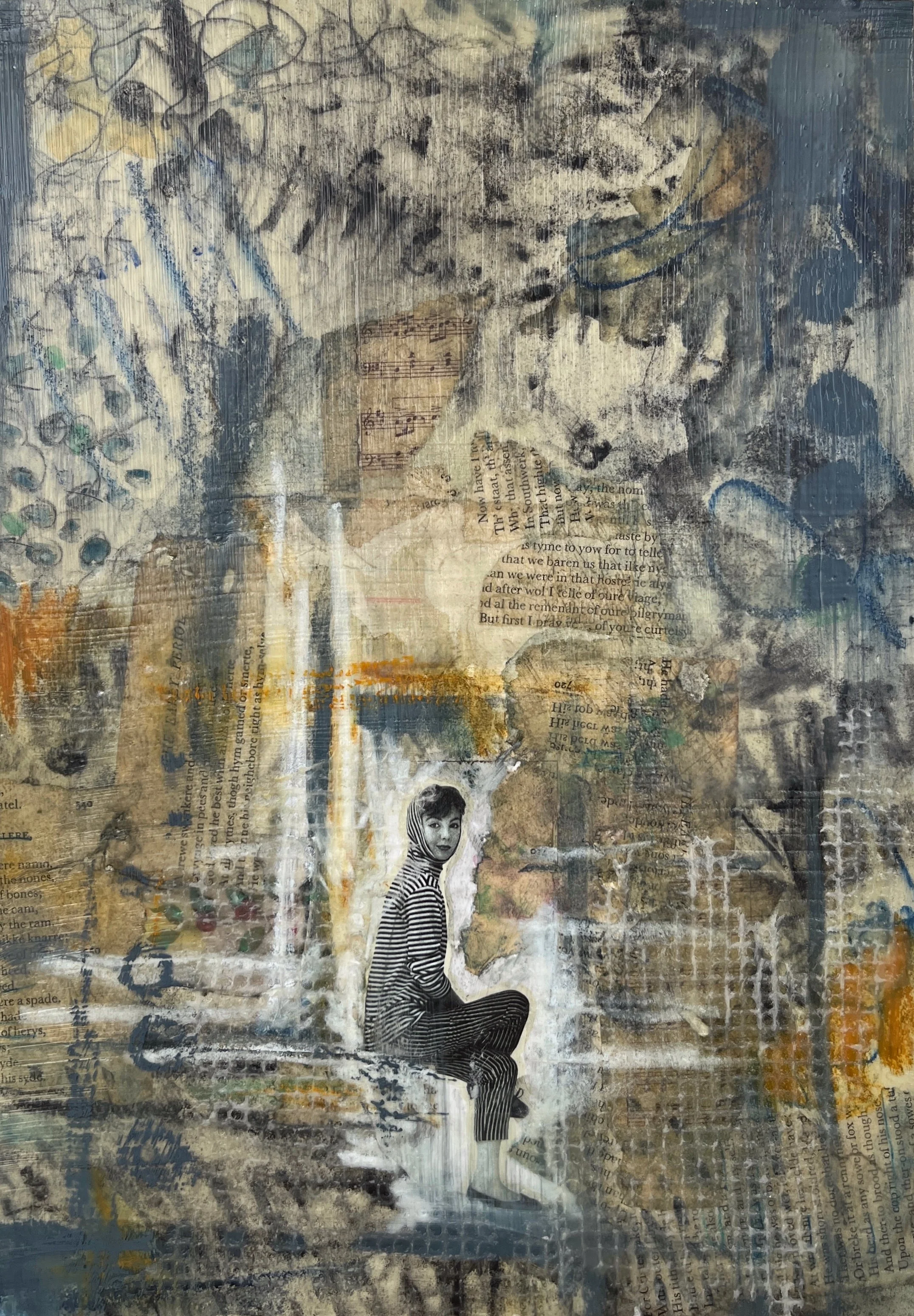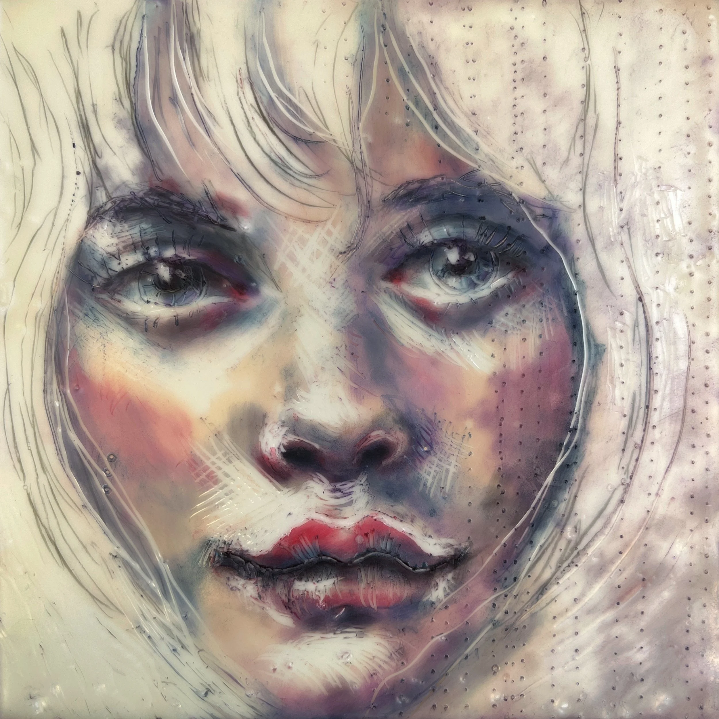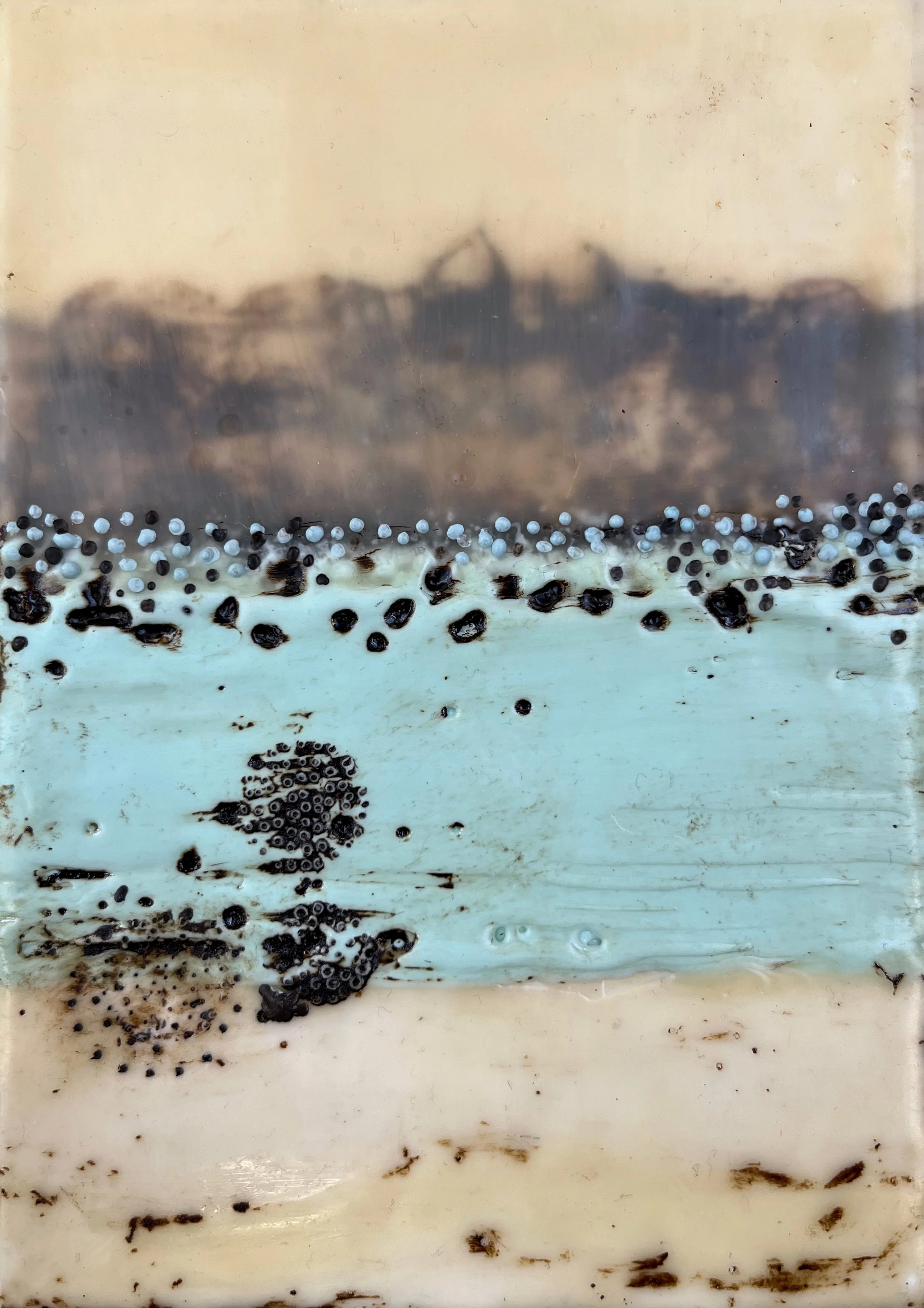 Bees wax and Damar resin are combined to create a medium. Pigments can be added. The wax is heated until it becomes liquid then it is painted, layered stencilled, collaged or printed.