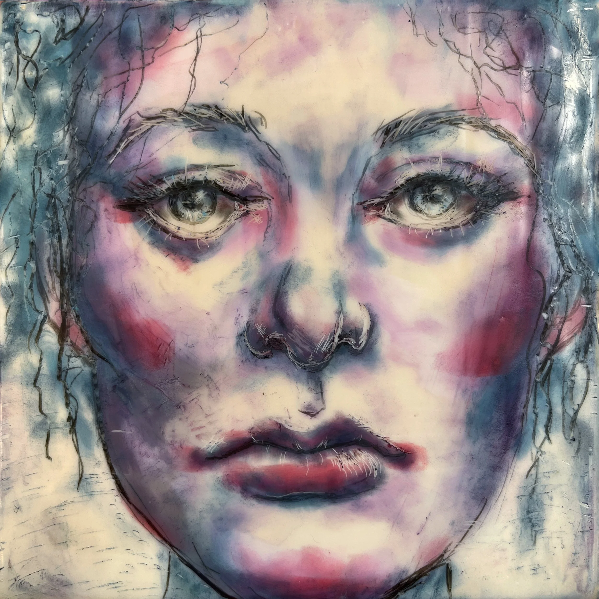 I love working with encaustic wax. Wax can be scraped molded, stamped, stencilled, drawn and more. No matter how I play with wax, it is a versatile and addictive medium to work with.